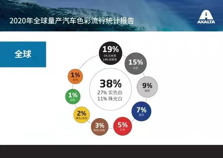 《2020年全球量產(chǎn)汽車色彩流行統(tǒng)計(jì)報(bào)告》顯示,白色已經(jīng)連續(xù)十年成為全球購(gòu)買最多的汽車顏色,黑色汽車的市場(chǎng)占比也達(dá)到了19%,是豪華車最推崇的顏色,灰色汽車的市場(chǎng)占比和去年相比提升了2%,達(dá)到了十年來(lái)的新高。